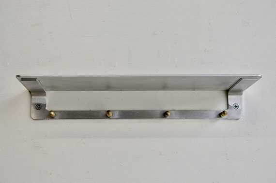 玄関廻りや洗面所など、ふと物を置く棚が欲しい場所に。重いものを置く事を想定していないため軽やかな構造としている。棚下のスペースも有効に使いたいので真鍮のフックを装備。