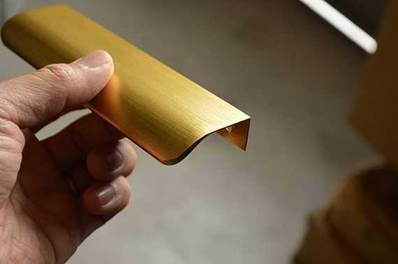 引出しの上面小口などに取り付ける引き手。手が触れる部分の
