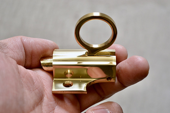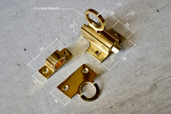 上げ下げ窓などに使用するラッチ。リング状のプルハンドルですので、手の届かない窓でもフック付きのポールなどで引っ掛けて開閉することができます。受け具は2種類ございますが、使用するシーンに応じて使い分けてください。