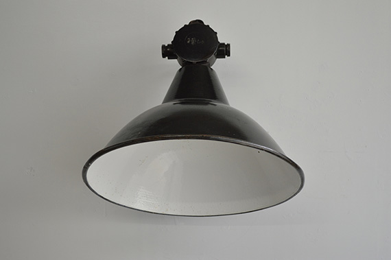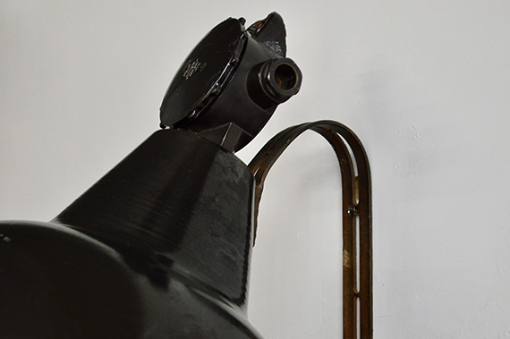 50~60年代、ポーランド製の大きな工業用ランプ。シェードにステーが後から溶接されて壁付仕様にカスタムされています。配線はジャンクションボックス内で結線してください。
